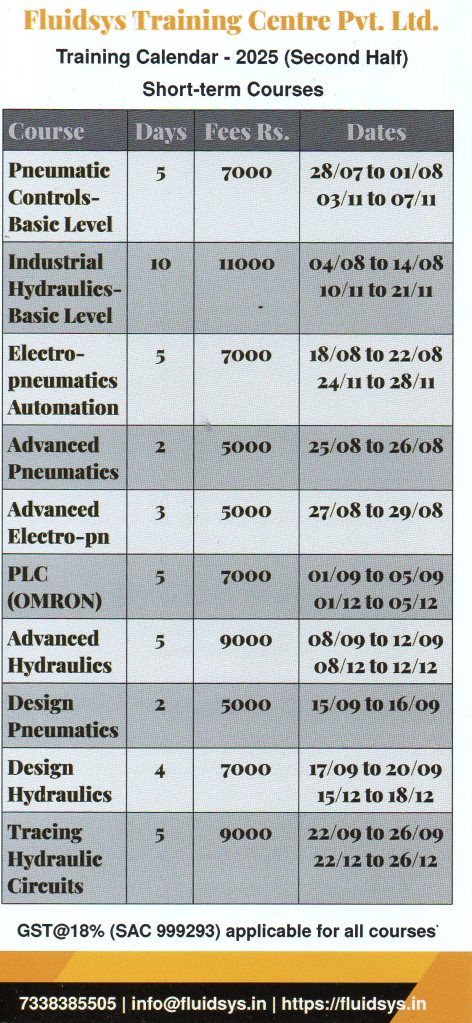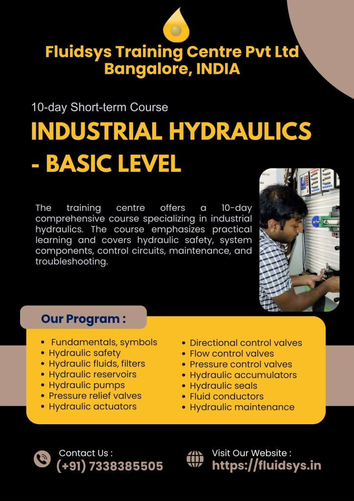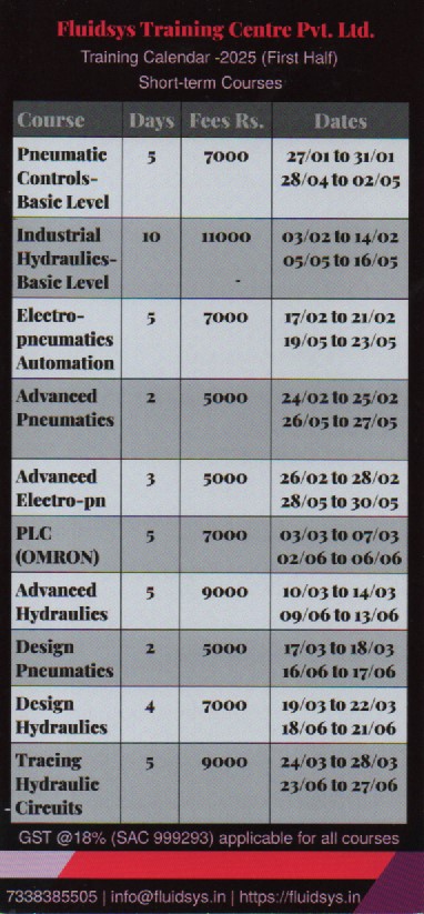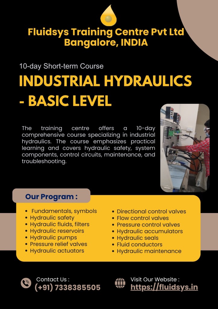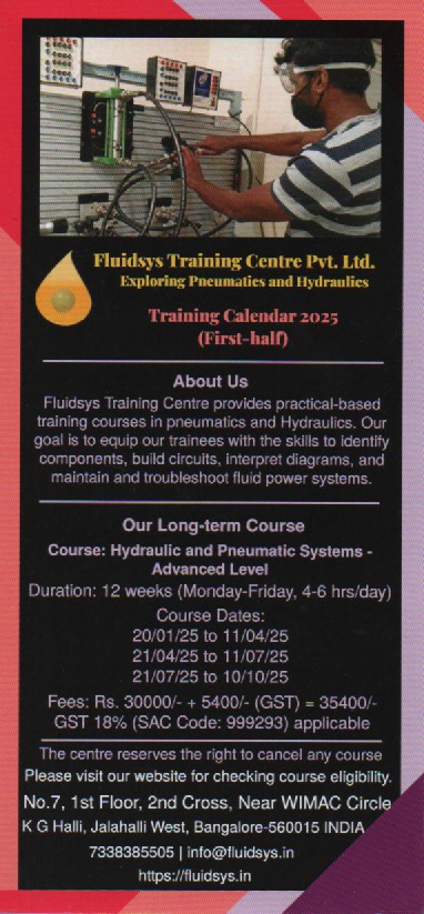 Fluidsys Training Centre provides comprehensive fluid power training, specializing in hydraulics and pneumatics with an emphasis on practical learning. The courses encompass safety protocols, system components, control circuits, system design, and maintenance & troubleshooting. The centre offers concept-oriented rather than product-oriented and practical-based short-term courses, internship programmes for engineering students, and customized on-site training for industries. If you are seeking dependable pneumatic and hydraulic training, Fluidsys training centre is the ideal choice.